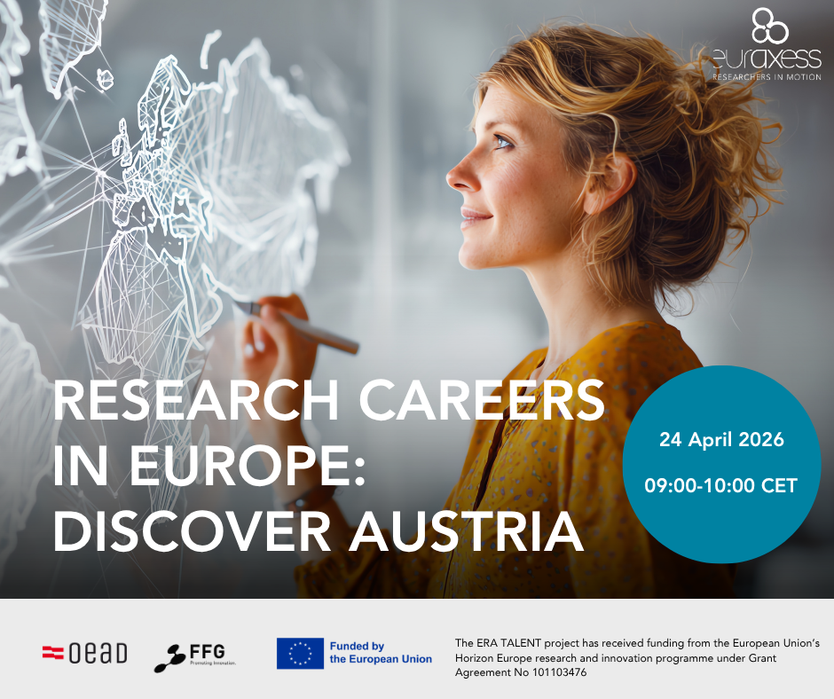 EURAXESS Austria (OeAD i FFG) zajednički organiziraju u petak, 24. Travnja (9.00-10.00 sati), jednosatni webinar „Research Careers in Europe: Discover Austria“.